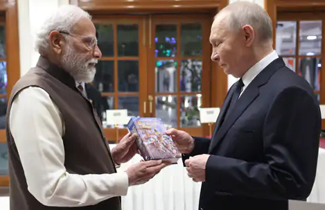 मोदी ने पुतिन को रूसी भाषा में लिखी गीता की प्रति भेंट की। मोदी ने X पर लिखा- दोस्त पुतिन का स्वागत करके खुशी हो रही है। आज सुबह 11 बजे पुतिन का औपचारिक स्वागत राजकीय सम्मान के साथ किया जाएगा।