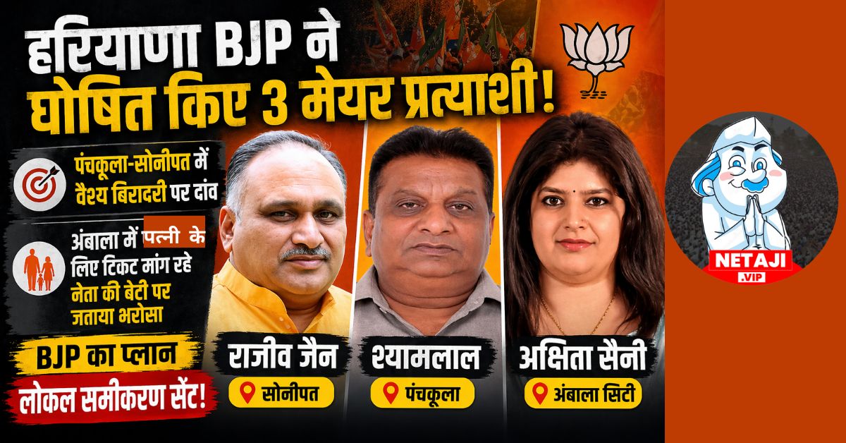 हरियाणा में नगर निकाय चुनाव को लेकर BJP ने तीन नगर निगम प्रत्याशियों के नाम घोषित कर दिए हैं। पंचकूला में श्यामलाल बसंल, सोनीपत से राजीव जैन और अंबाला में अक्षिता सैनी को मौका दिया है।